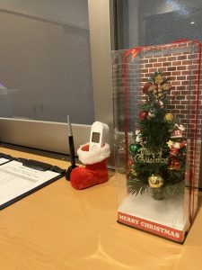 また、面会簿記入のカウンターにもミニツリーとサンタの靴を置いて、季節感を演出中です( ◠‿◠ )
